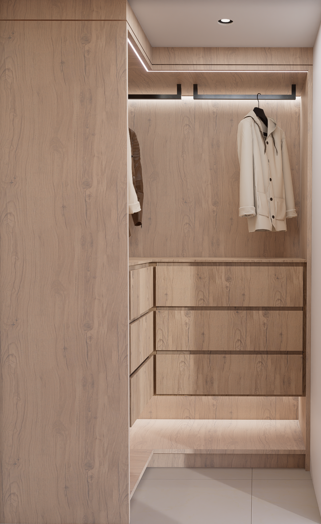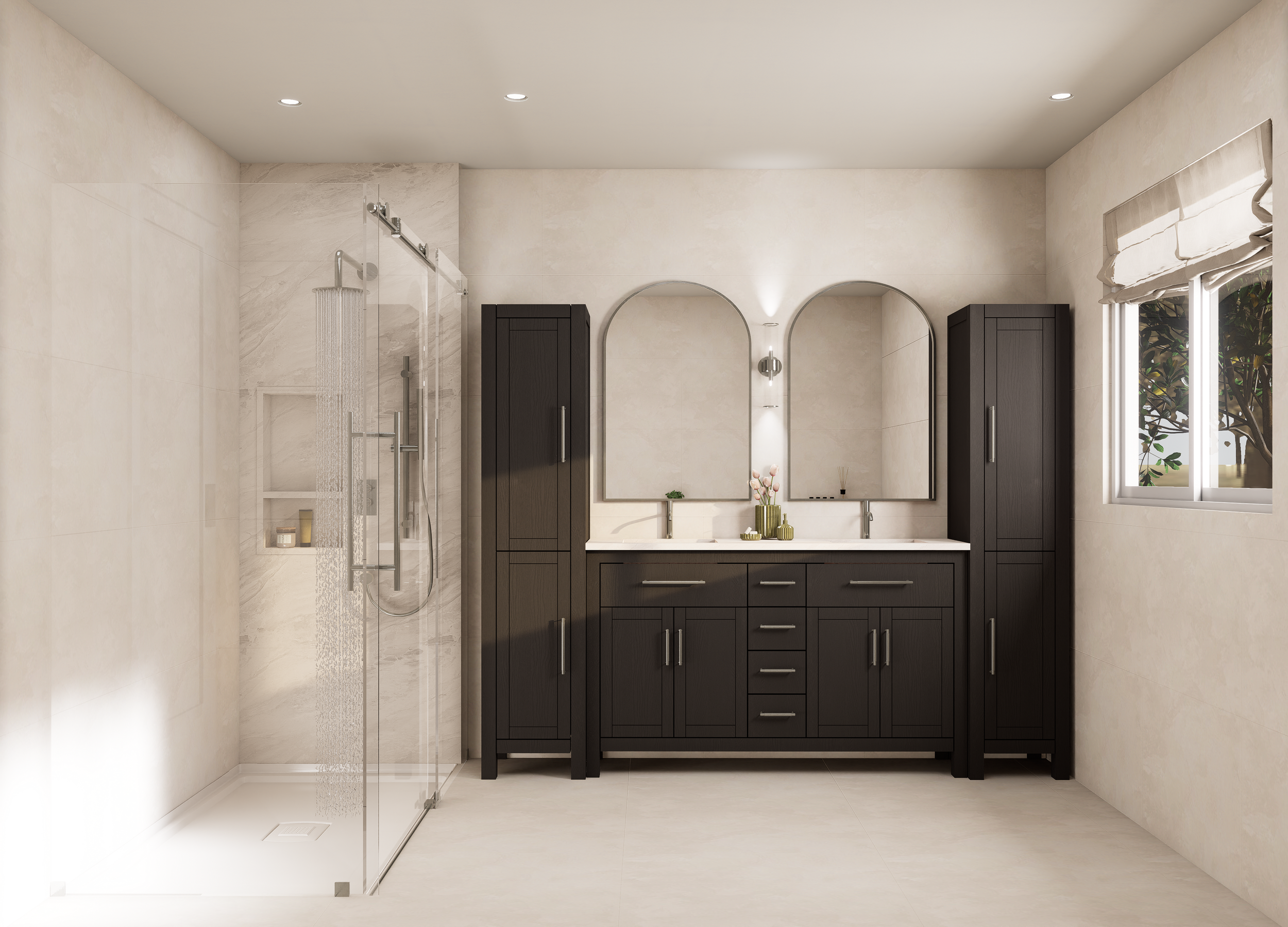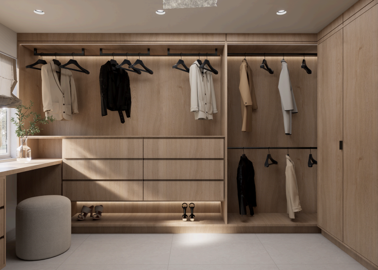 Dans cette résidence située à Laval, j’ai repensé deux salles de bain ainsi que deux walk-ins dans un esprit profondément minimaliste et apaisant, inspiré du style Japandi. L’objectif était de créer des espaces fluides, ouverts et fonctionnels, où chaque élément trouve sa place avec intention et sobriété. Les matériaux naturels et les tons terreux ont guidé toute la conception : bois pâle, pierre texturée, céramique mate, linéaires épurés. Le tout forme une palette douce et cohérente, mettant en valeur la beauté des textures plutôt que la multiplication des éléments décoratifs. L’aménagement des deux walk-ins a été pensé dans la continuité de cette approche minimalisme fonctionnel, rangements dissimulés, circulation fluide et lumière douce. Le tout forme un ensemble harmonieux, équilibré entre esthétisme et usage quotidien. La lumière naturelle, amplifiée par un éclairage indirect bien maîtrisé, renforce l’ambiance sereine, presque méditative. Chaque pièce invite au calme et à la simplicité, tout en répondant aux besoins pratiques de la vie moderne. Ce projet incarne pleinement ma démarche de design : créer des lieux à la fois élégants, simples et profondément ancrés dans le confort sensoriel.
